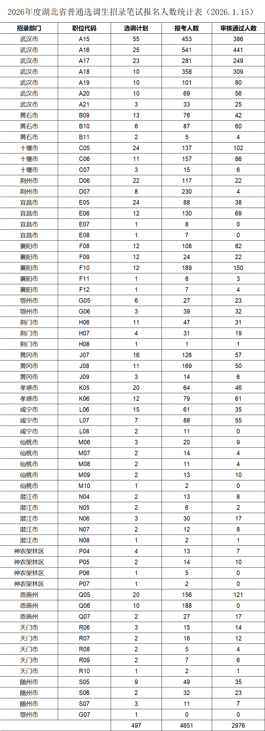 2026年湖北省普通选调生招录笔试报名人数统计表(2026.1.15)
