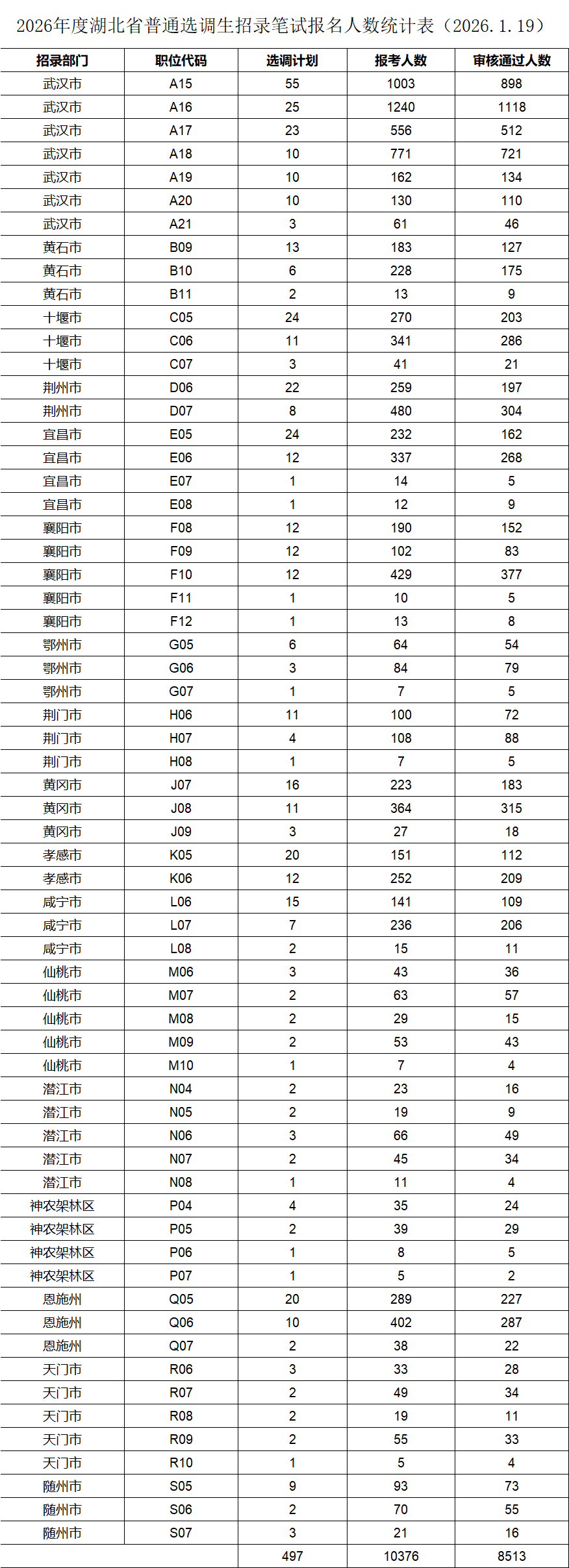 2026年湖北省普通选调生招录笔试报名人数统计表(2026.1.19)